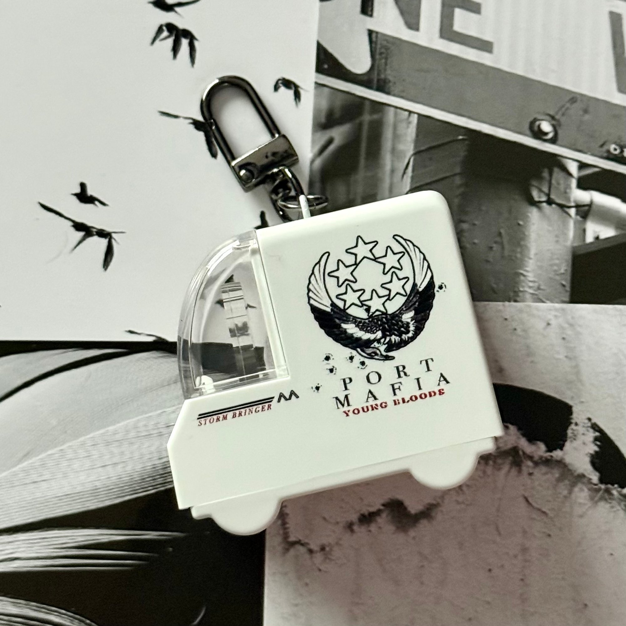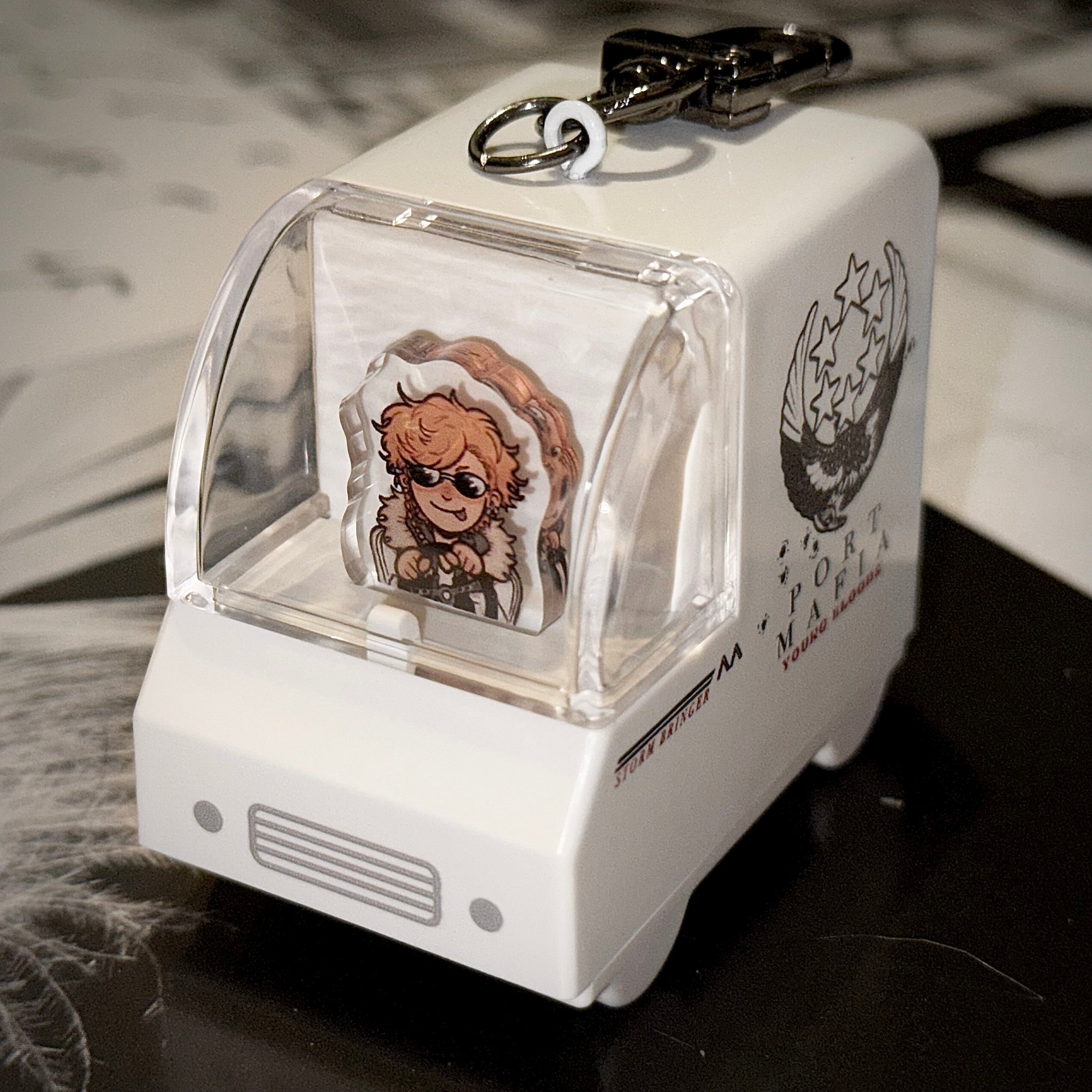 This keychain features a mini fanmade acrylic standee of the character “Albatross” from Bungo Stray Dogs’ Light Novel: Storm Bringer inside a 3D car keychain!